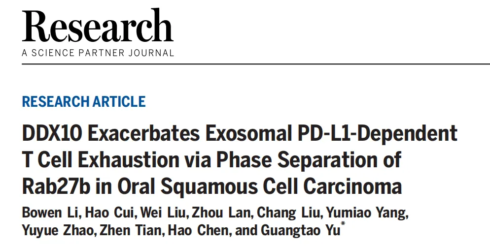 [1] Li, B., Cui, H., Liu, W., et al. DDX10 Exacerbates Exosomal PD-L1-Dependent T Cell Exhaustion via Phase Separation of Rab27b in Oral Squamous Cell Carcinoma. Research, 2025 May 9;8:0697.